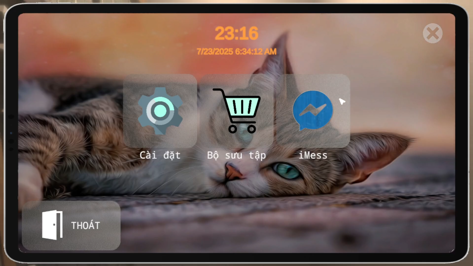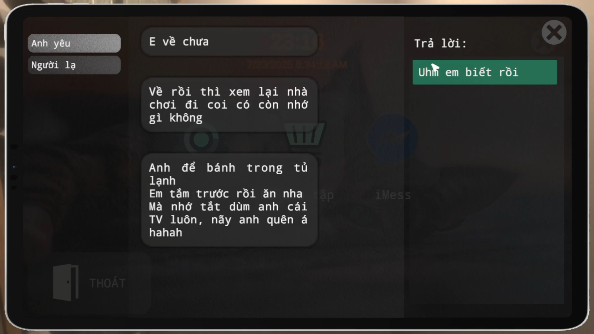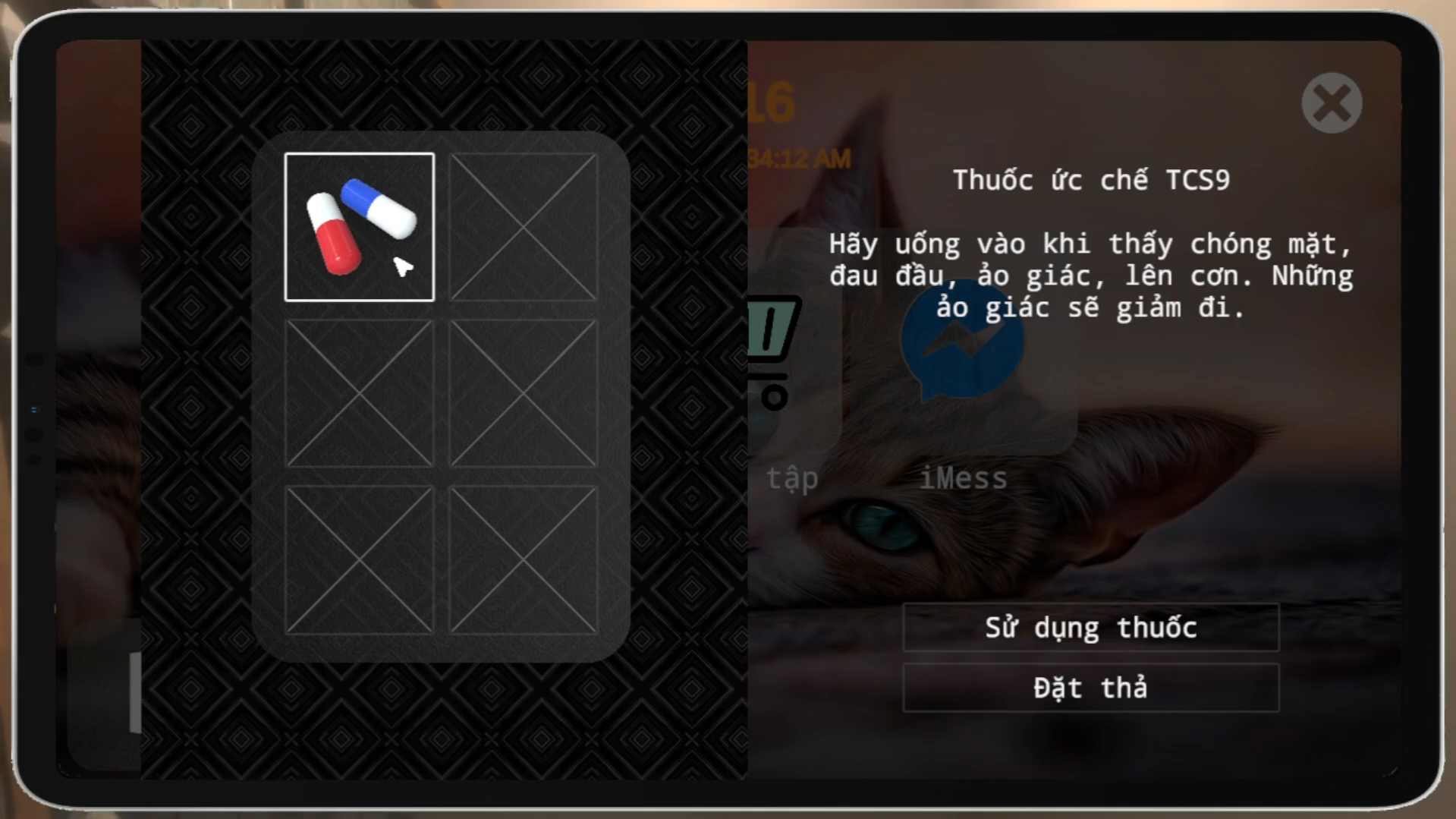 When opening the menu with the tab button, the interface will appear like on the Ipad screen, including the exit button, the settings button, the Inventory button and the IMess button which contains the simulated messages when playing. Press the M button to open the phone and you will see small fun demo tools simulating the phone (however, those tools do not work or only have symbolic functions, the main function of the phone is to turn on the flashlight and use the light to burn ghosts and magical entities). When turned on, the phone will be on the right side of the screen.