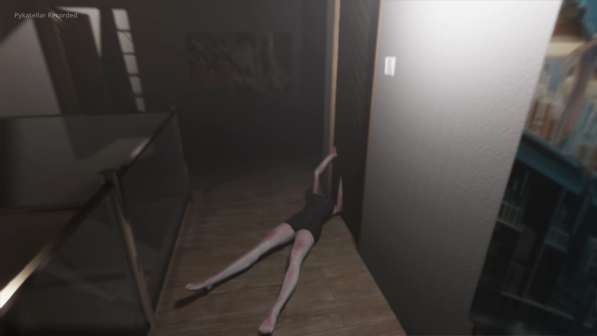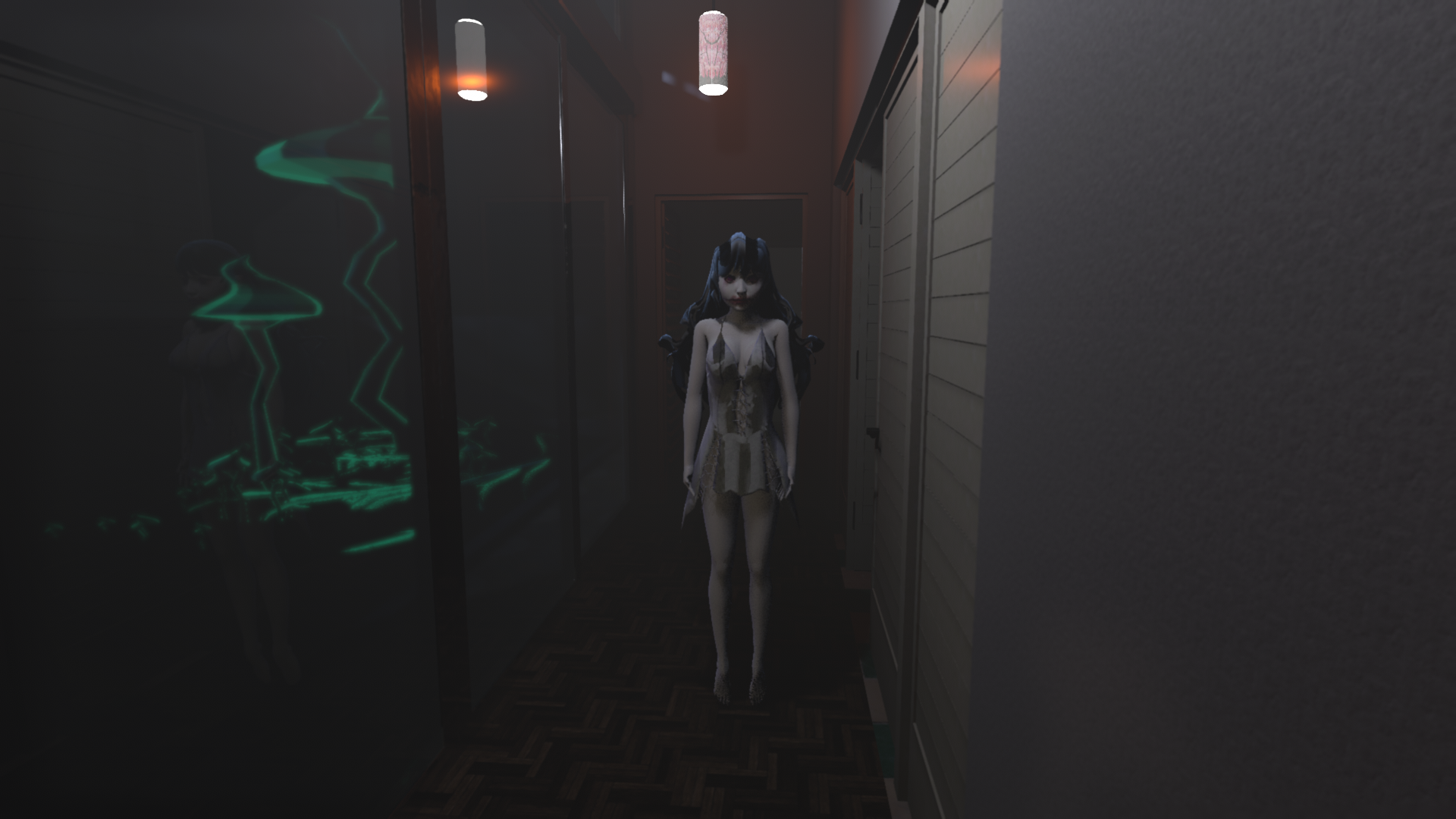 This is the first place when you open the game (before that you may have seen the Pykatellar studio logo and the ESRB Rating logo for Mature). You will immediately see the scene in a place that looks like a bathroom, the main camera will be sitting on the floor. On your left is a slightly dirty white bathtub and the faucet is dripping with disgusting drops of blood, the bathtub also has a broken oval mirror leaning against the side to test the hand tracing reflection effect (if you turn it on, you will immediately see a reflection of a picture of a girl wearing a white kimono-like dress, a ghost face, a sewn-up mouth and horrifying blood, this picture is actually a framed photo placed on the wall behind the camera). To your right is a black living entity like venom and on the slimy surface there are moving veins, one root clings to the floor and the other clings to the ceiling like a tree, on its trunk are bright orange eggs (this egg will hatch into a monster). On the right wall is the door to this room. In front of the camera in the room architecture is a modern Japanese style window looking out is a rain, the rain is also red like blood, sometimes there is thunder and lightning. The camera is not static but moves as if trying to look up at everything in the room, when looking down right on the floor you will see the bloody horror style text of the game title with the note Early Access and Pykatellar Studio. The floor and ceiling seem dirty.