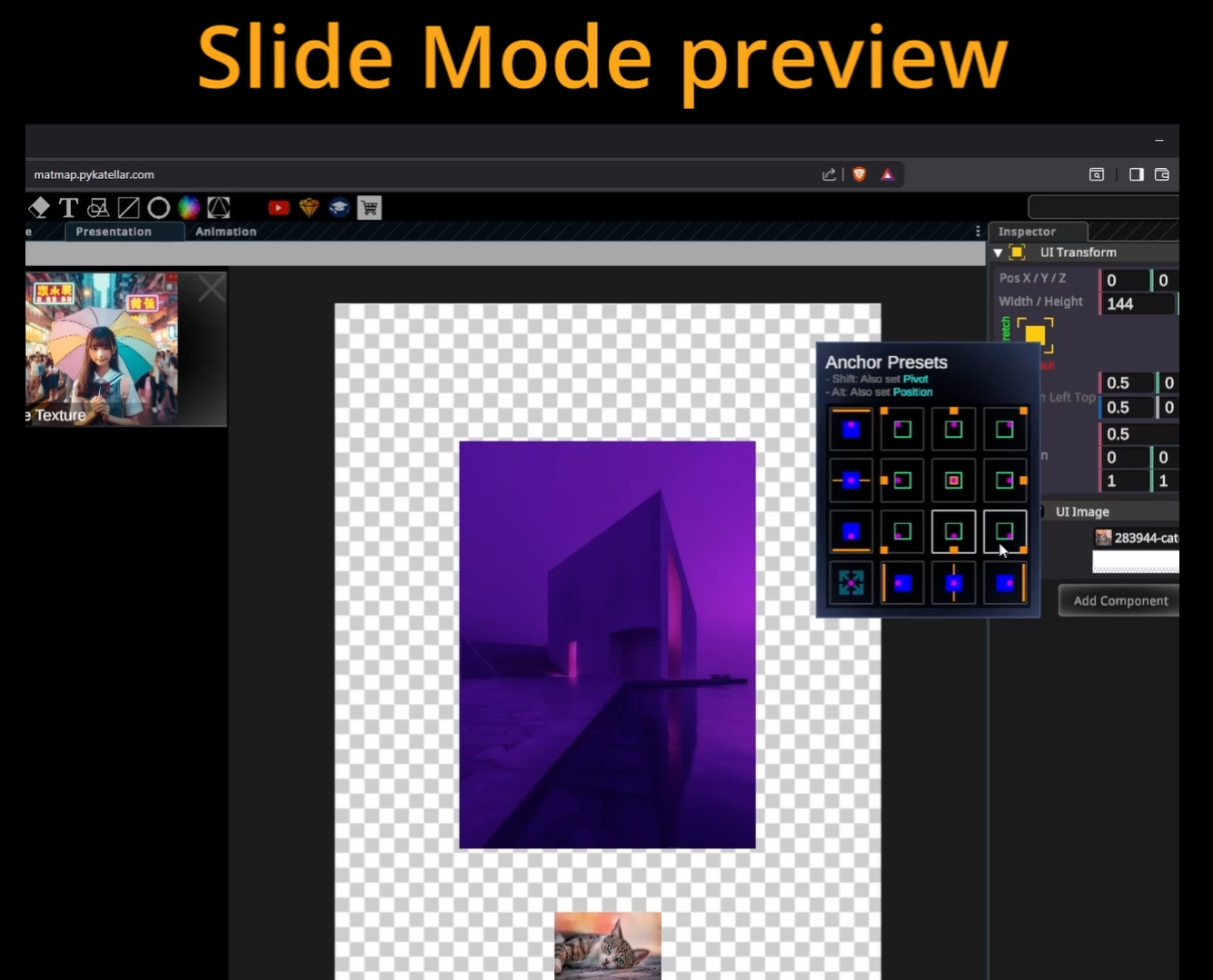 2. Entity-component system (ECS) architecture brings a design style like a game engine, everything inside Matmap is an entity with three main types of entities: Transform (3D entity), Rect Transform (Photo/Texture editing entity), UI Transform (Slide entity) corresponding to the 3 main types of Matmap features.