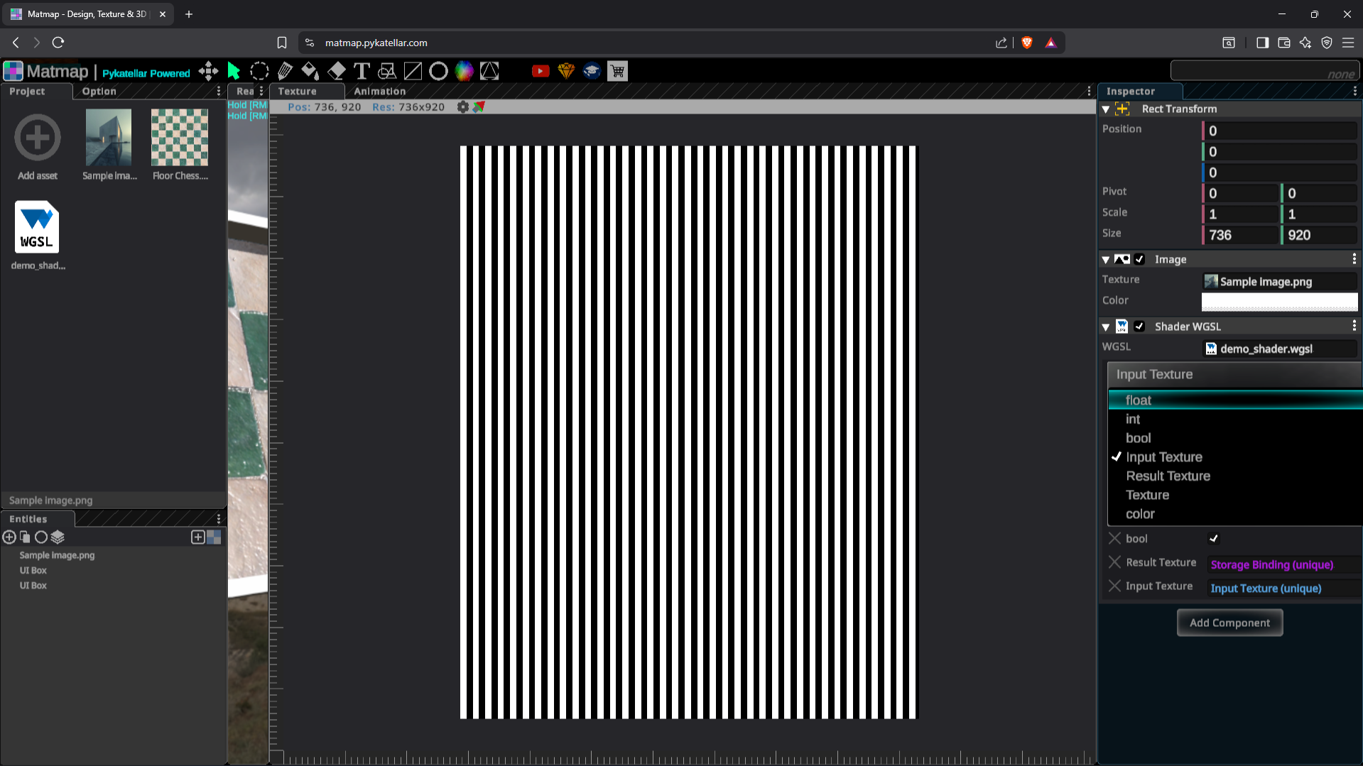 - WGSL Shader: this component allows designers to use WGSL code to edit their own photos, import WGSL files into Matmap and drag and drop them into the component's WGSL asset box.