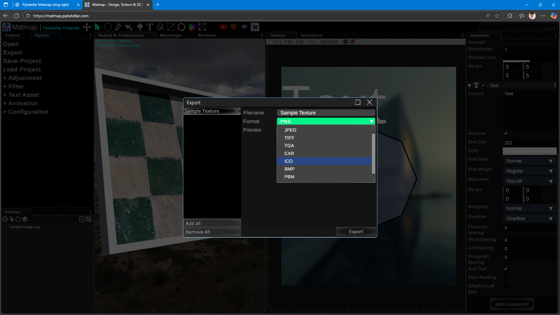 5. Support exporting photos in many formats: png, jpeg, tiff, tga, exr, ico, bmp.